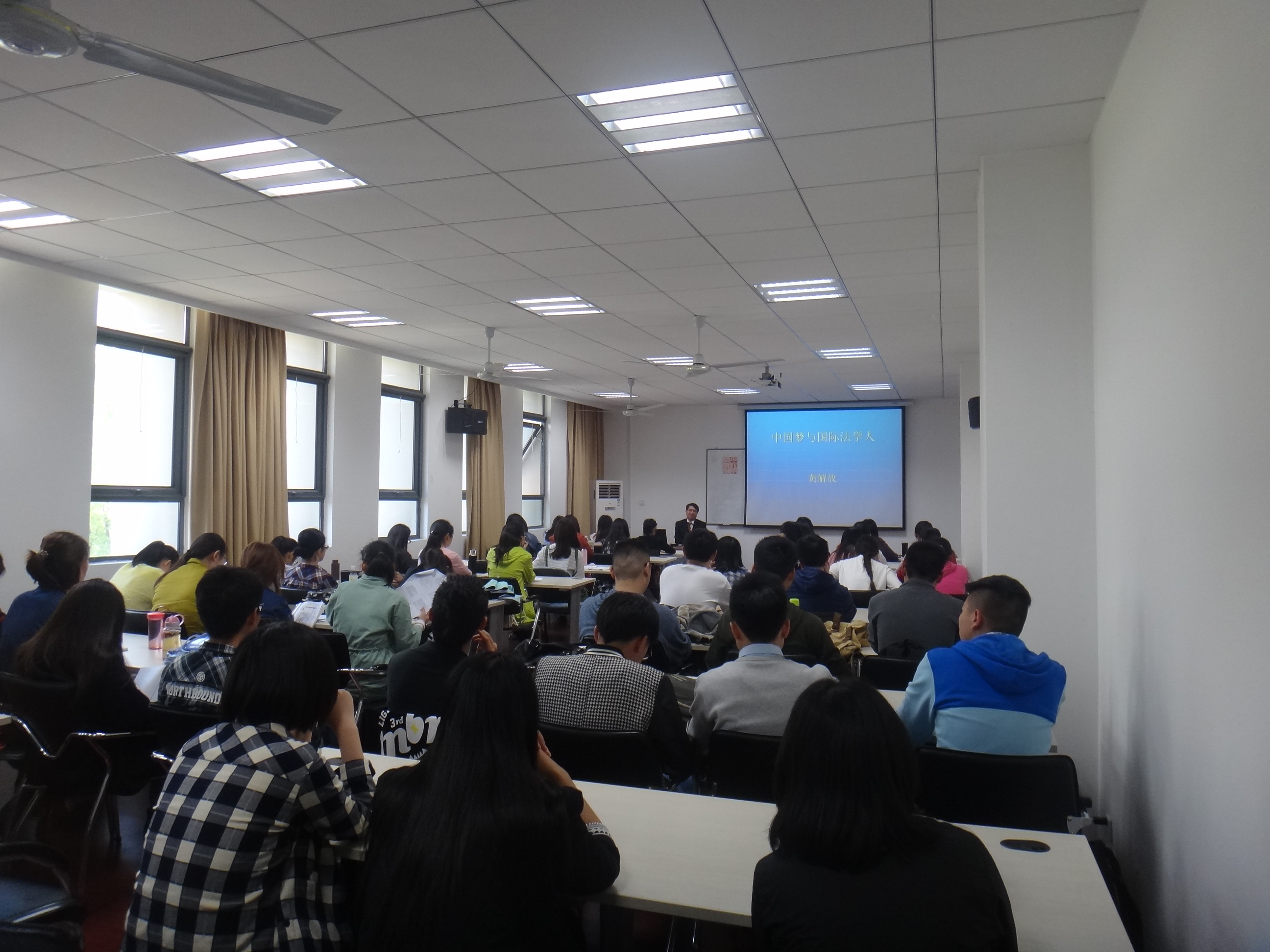 黄解放为法律系师生做了题为“中国梦和国际法学人”的讲座,引起了与会师生的强烈共鸣,黄先生还认真回答了学生们关注的无人机法律规制、国际民航组织运行等问题。他鼓励同学们放眼世界,学好外语,用自己所学服务于民航强国建设的伟业。
