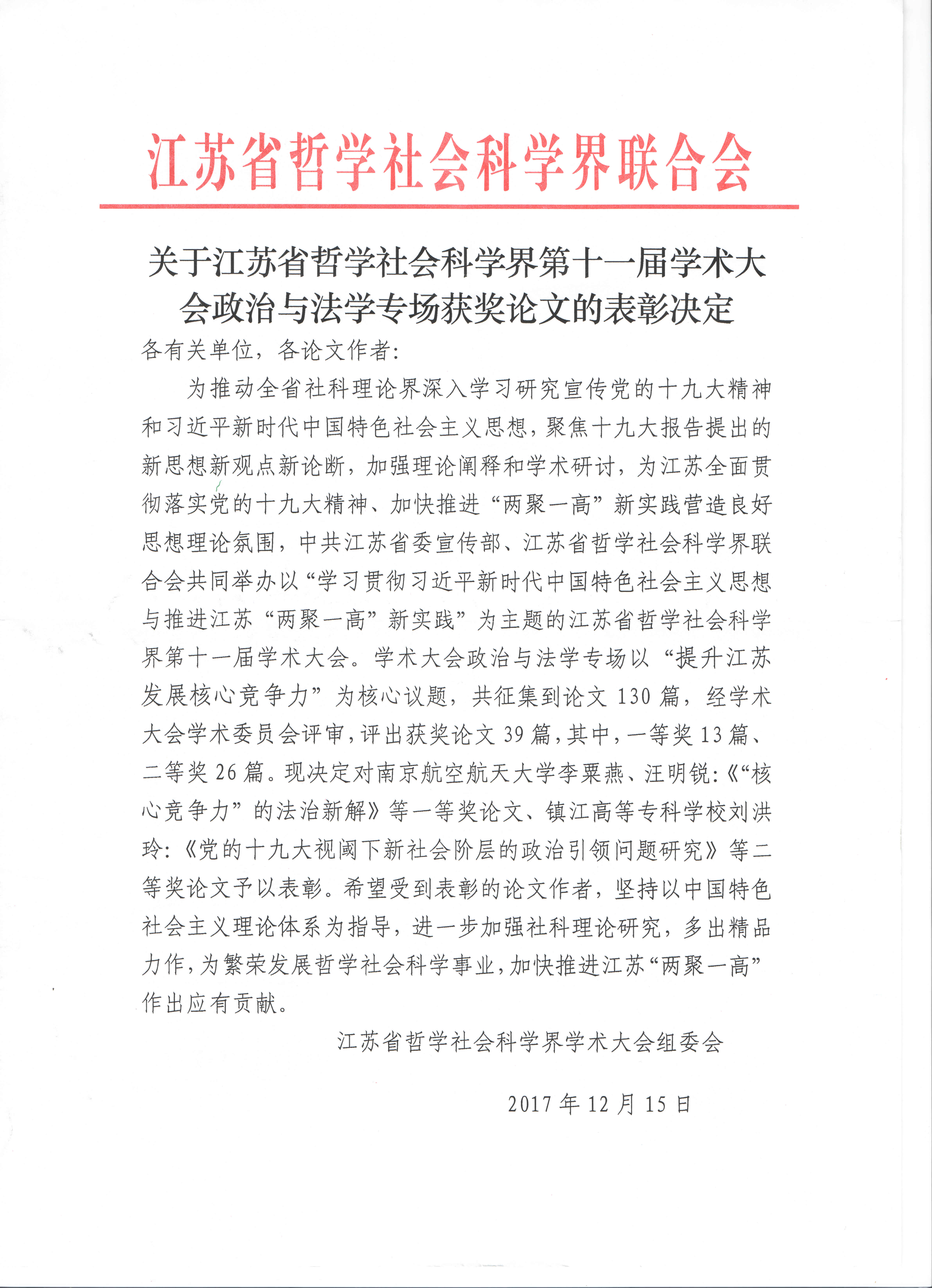 江苏省哲学社会科学界第十一届学术大会政治与法学专场的主题是“提升江苏发展核心竞争力”,来自省内外高校、党校、科研机构和法律实务界的代表100多人参加了政治与法学专场的会议,围绕这一主题展开热烈研讨。本次会议共征集论文130余篇,经学术委员会评审,评出获奖论文39篇,韩漫画 李栗燕教授与其研究生汪明锐同学合作的论文《“核心竞争力”的法治新解》荣获江苏省哲学社会科学界第十一届学术大会优秀论文一等奖,李栗燕教授应邀参加会议并在法学专场作了大会发言。
