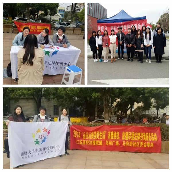 在为同校师生服务的同时,人文学院师生及南航大学生法律援助中心的志愿者们还积极走出校门,为社区的居民提供服务。3月14日南航大学生法律援助中心应邀参加由江苏省高校法援联盟、郑和广场、马府街社区联合主办的消费者权益保护大型法律咨询服务活动,通过在郑和广场设立咨询点,设置展板等方式,志愿者们向群众普及相关法律以保护其消费权益,同时也为市民解答商家霸王条款、遗产继承等相关问题,累计服务80余人次,发放消费维权法典200余份,受到了居民的一致好评,也与各高校法学专业同学增进交流。