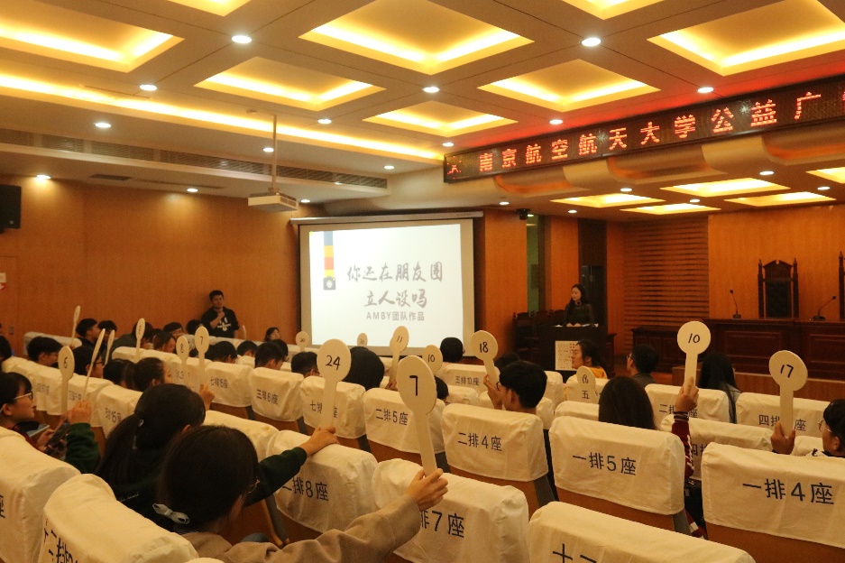 在南航六十六周年校庆之际,10月19号晚七点, “公益为媒 · 广而告之”韩漫画 首届公益广告设计大赛在韩漫画 模拟法庭成功举办。人文学院代理团委书记、辅导员彭汉帝,本科生辅导员聂小芳、研究生分团委副书记王梦珂、研究生尚靖凯,校科协主席谢文雅出席比赛,与三十位大众评委共同参与最终大奖的归属的抉择,来自各个学院的同学在台下观看了全场比赛。