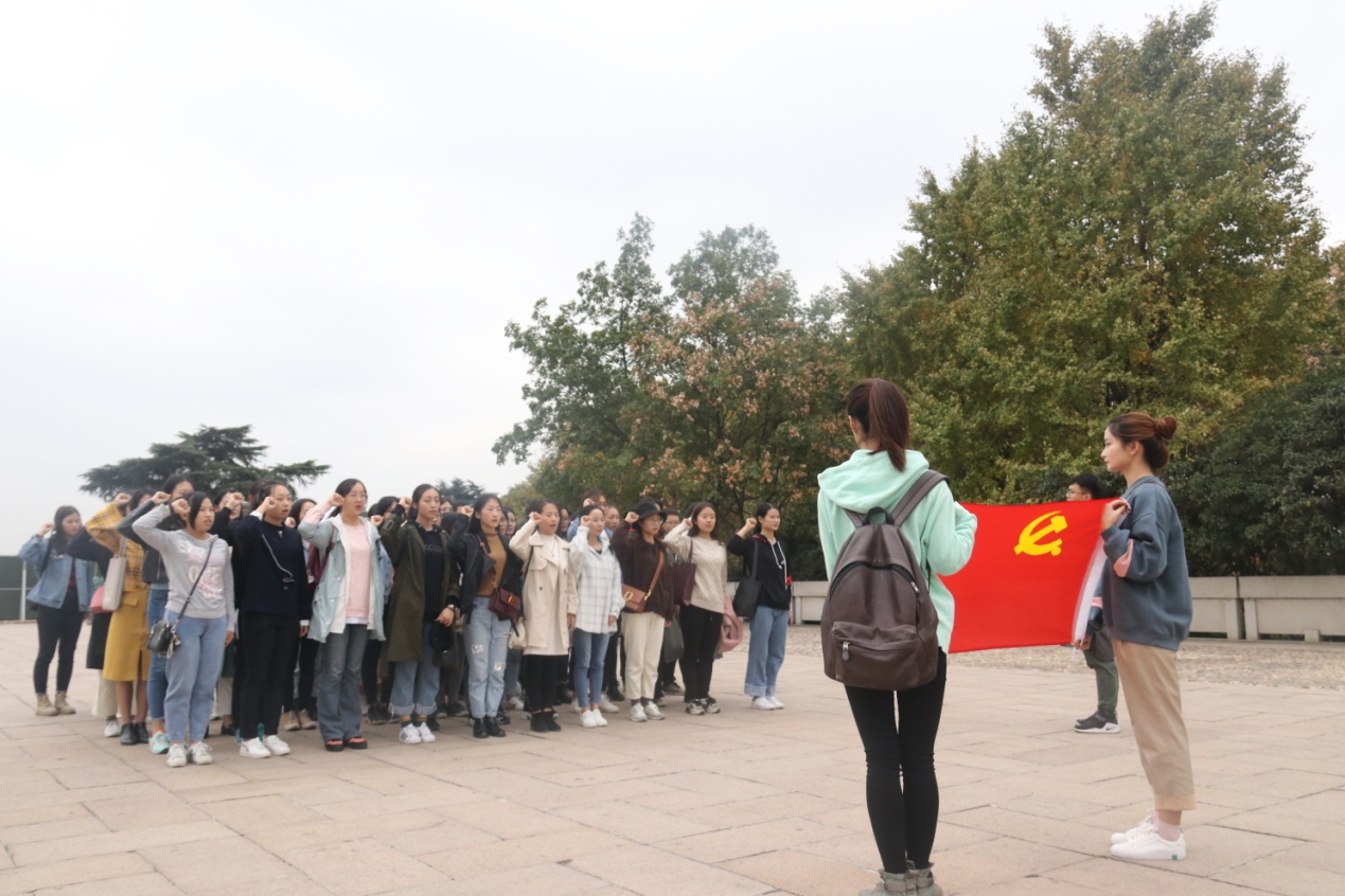 同学们在辅导员彭汉帝、聂小芳的带领下首先来到烈士纪念碑广场,在庄严肃穆的革命烈士纪念碑前,由研究生党支部书记尚靖凯领誓,全体成员列队面向党旗,高举右拳,进行党员宣誓,再次接受党性洗礼,增强历史使命感和社会责任感,激励同学们以党章严格要求自己,以一名合格共产党员的标准规范自己。