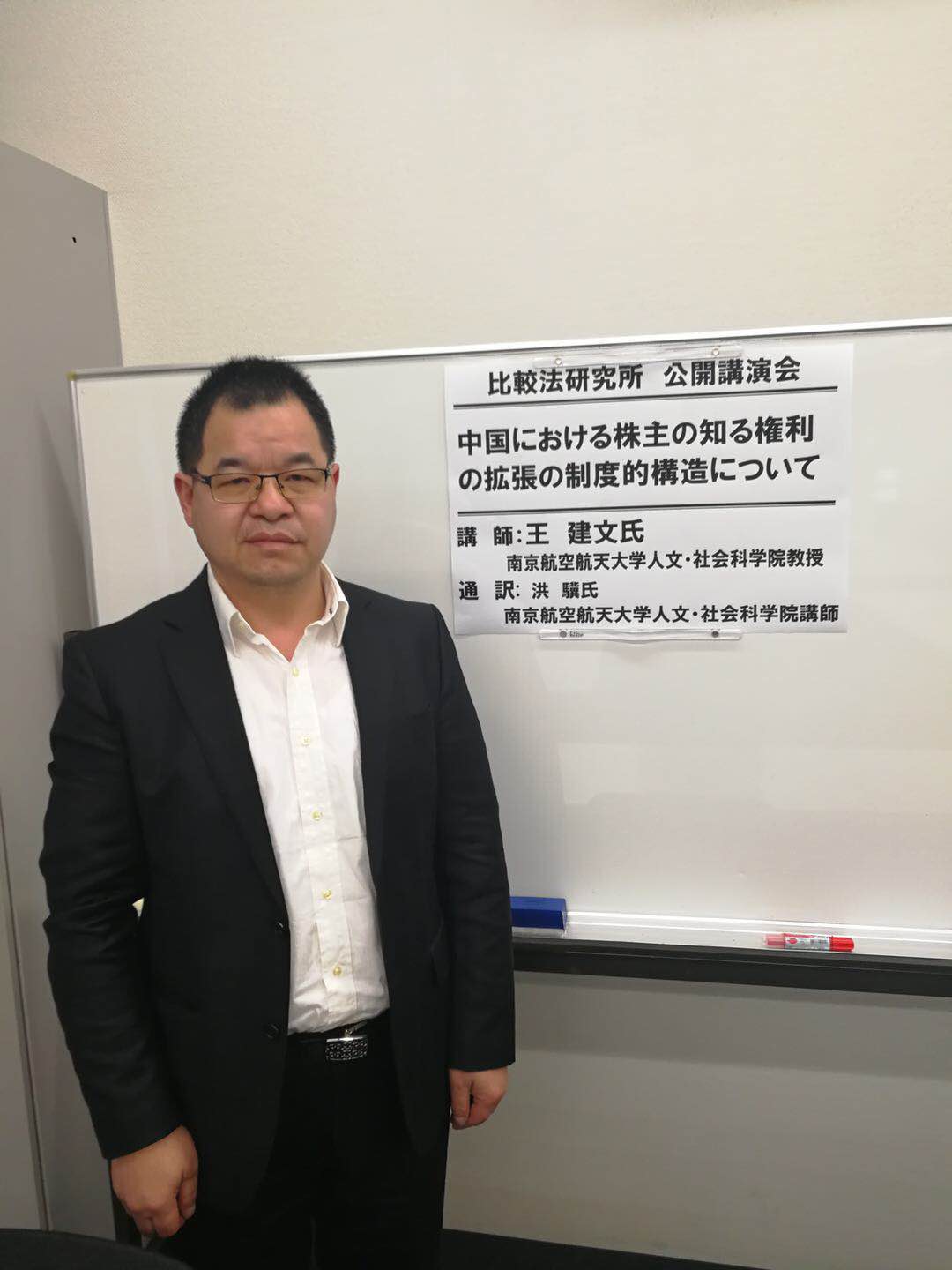 在早稻田大学比较法研究所与法学部的共同安排下,王建文院长还于当地时间4月12日下午13时整举行了一场题为“论我国股东知情权穿越的制度构造”的学术报告。整个报告持续了近两个小时,早稻田大学法学学术院师生聆听了讲座,甚至还有俄罗斯大使馆的相关人员也慕名而来。在答疑互动阶段,日方学者就中日两国现行公司法在制度设计上的差异提出了非常棘手与专业的问题,王院长从社会背景、立法目的、司法实践等多个角度切入,详尽细致地给出了合理解答,赢得了热烈的掌声。会场上,韩漫画 洪骥老师全程承担了报告与答疑的翻译工作。