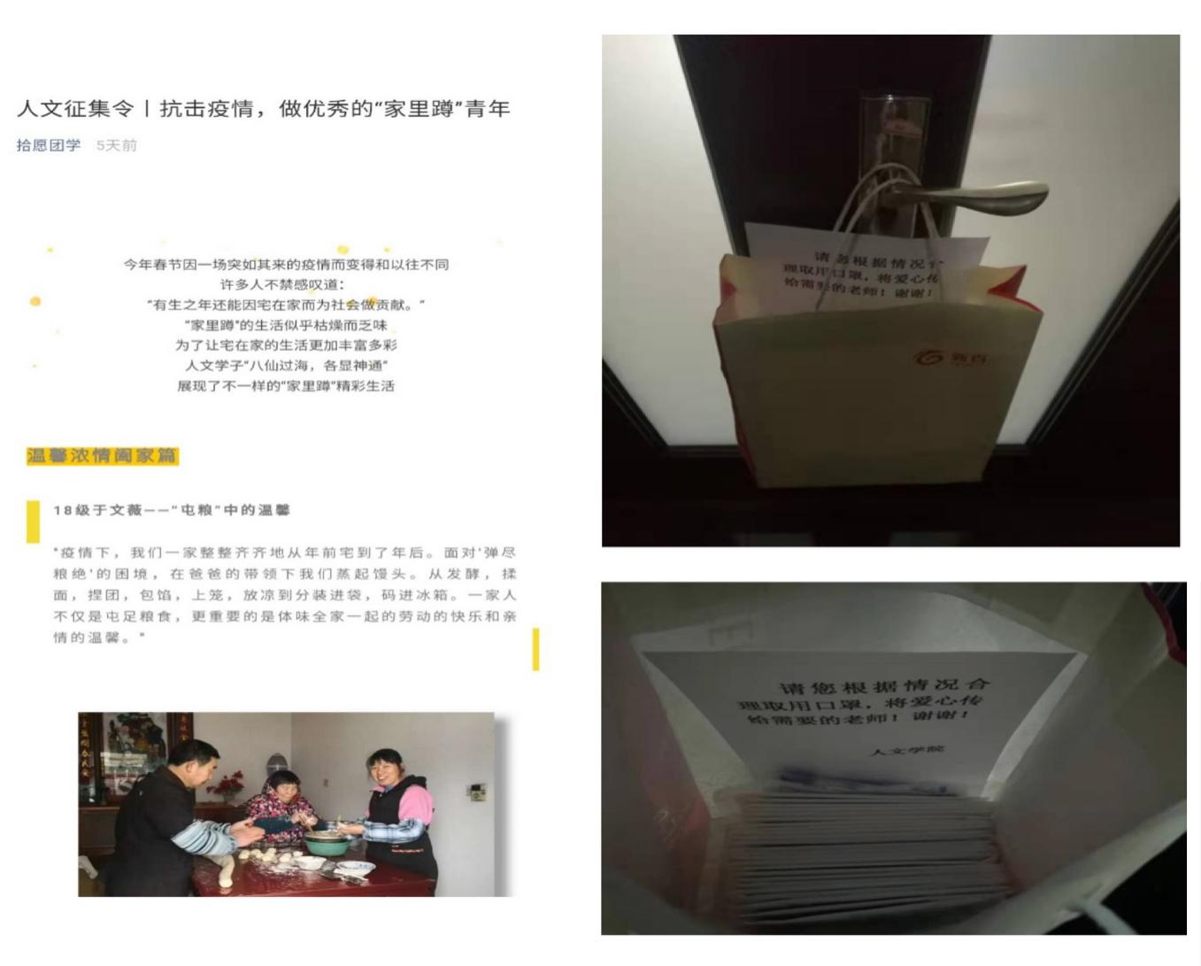 “隔离病毒,不隔离爱”,学院在严格落实疫情防控工作的同时,注重人文关怀。学院领导主动带头为正在居家隔离的教职工代值班,学院领导班子成员个人主动捐献口罩,为急需的教工快递口罩,并在学院设立了取用点,为值班值守、到院教职工提供紧缺防护物资;为不影响学生课业,学院积极配合学校,广泛动员师生开展线上教学准备工作,建立了线上教学教师交流群,做好软件应用、政策解释和相关服务,全力保障“延迟开学不停学”,保证学生能够“居家研学”;同时,学院重视加强与学生的沟通联系,充分发挥学生党员、班干部、团干部的力量,成立年级疫情防控工作小组,将每日排查防控上报作为重点工作,点对点细化到每一位学生;为让同学们假期加强学习,学院发起了“人文征集令”活动,号召同学们在家也能过的有计划,有意义,做优秀的“家里蹲”青年;学院教师还积极通过撰写诗歌,学生通过绘画等方式积极发声,隔空传递爱的力量,声援武汉人民坚定战胜疫情的信心。
