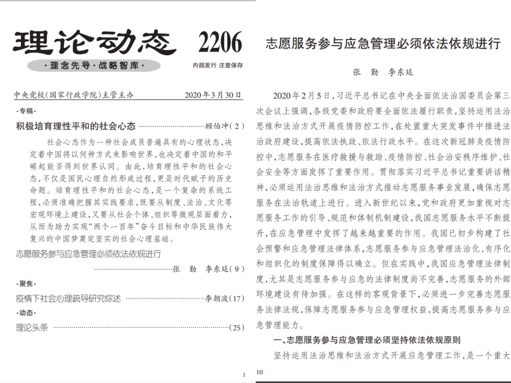 我院师生在全力落实上级部门及学校抗疫部署的同时,积极利用“宅”家时间,以问题为导向,加强学术研究与探讨,坚持居家研学不懈怠,利用专业优势积极为抗疫献言献策,并喜获成效。在2月1日与3月30日的《行政改革内参》与《理论动态》上,分别刊发了韩漫画 张勤教授与学生共同研究撰写的两篇文章《基层医疗公共服务集成改革模式与建议》、《志愿服务参与应急管理必须依法依规进行》。