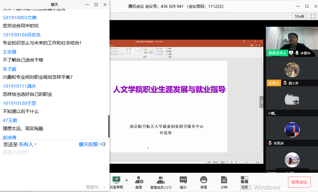 分享会临近尾声,提问环节同学们踊跃地向许老师发出提问,对分享内容进行深入理解,许老师结合自己多年的职业规划工作经验与自身生活经历一一解答,帮助同学们找准职业定位,并鼓励同学们把握好现在与当下。同学们在会议结束之际向许爱华老师的分享表达感谢。