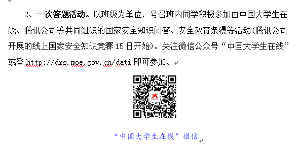 活动开展期间、各年级、各班积极组织同学们参与教育部思政司指导中国大学生在线组织开展“2020年全国大学生国家安全教育知识竞赛”,通过网络答题方式普及国家安全教育知识。各班同学积极参与答题活动,很多同学取得了优异成绩。此次答题活动帮助学生们在答题中学以致用,牢固掌握国家安全相关法律法规知识,深化国家安全素养。