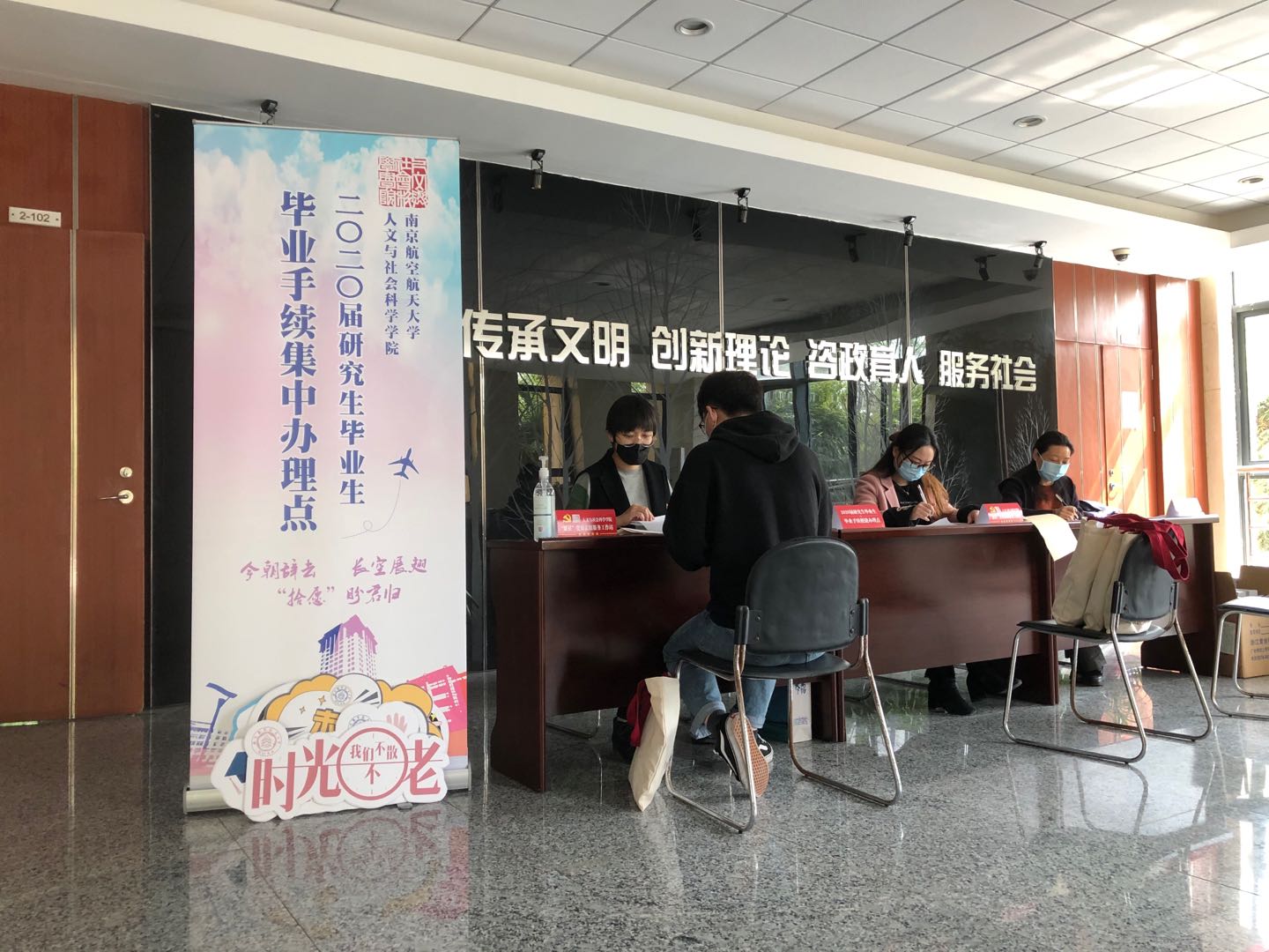 毕业生返校前,学院精心营造了温暖的氛围,在学院大厅,为研究生搭建了毕业手续办理的一站式服务工作台,并提前向毕业生发送一站式服务说明文件,以保障毕业工作井然有序、方便快捷地进行。同时,学院大厅设置带有“人文”及“青春”等字眼的定制手持板等宣传物品,方便毕业生留影纪念,勉励其不忘初心,不负青春。返校学生纷纷与学院老师亲切合影,记录在人文学院美好的研究生生活,并感谢老师三年来的辛勤付出。为更好为学生做好服务工作,学院积极发挥“繁星”党员志愿服务站的引领作用,组织机关党员爱心转送车队帮助解决毕业生行李运送困难等问题,得到了一致好评。
