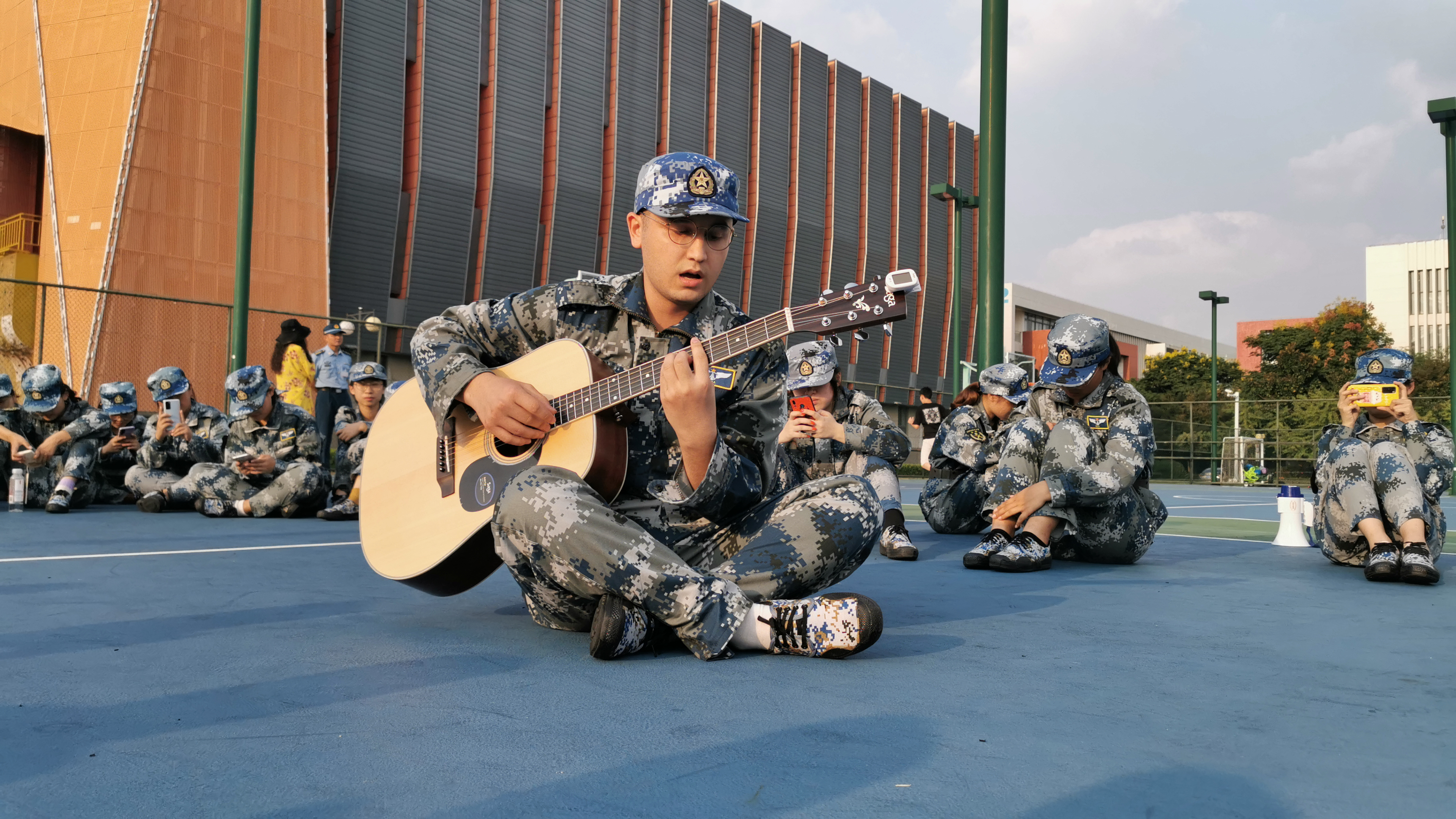 休息间隙,教官卸下了训练时的严肃面孔,同学们也不放过这个展现自我、结交好友的好时机。有的同学大大方方地走上前,一展歌喉,有的同学甚至精心准备了吉他演奏,也有的同学带来了别具一番风情的新疆舞蹈。欢声笑语,不绝于耳,空气中满是轻松的气息,大家训练的疲惫也在此时渐渐消去,取而代之的,是日渐深厚的情谊。