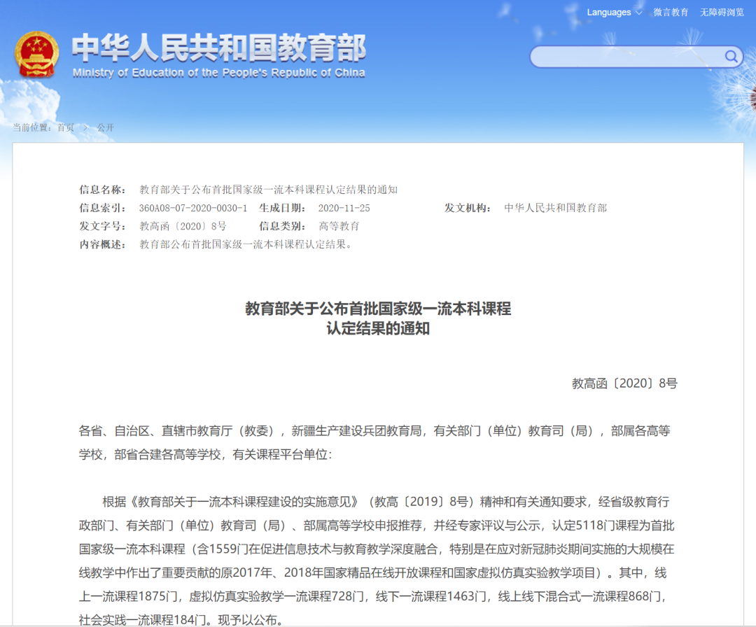 2020年11月30日,教育部官网发布《教育部关于公布首批国家级一流本科课程认定结果的通知》,韩漫画 《网络与人工智能法》课程入选“首批国家级一流本科课程”。