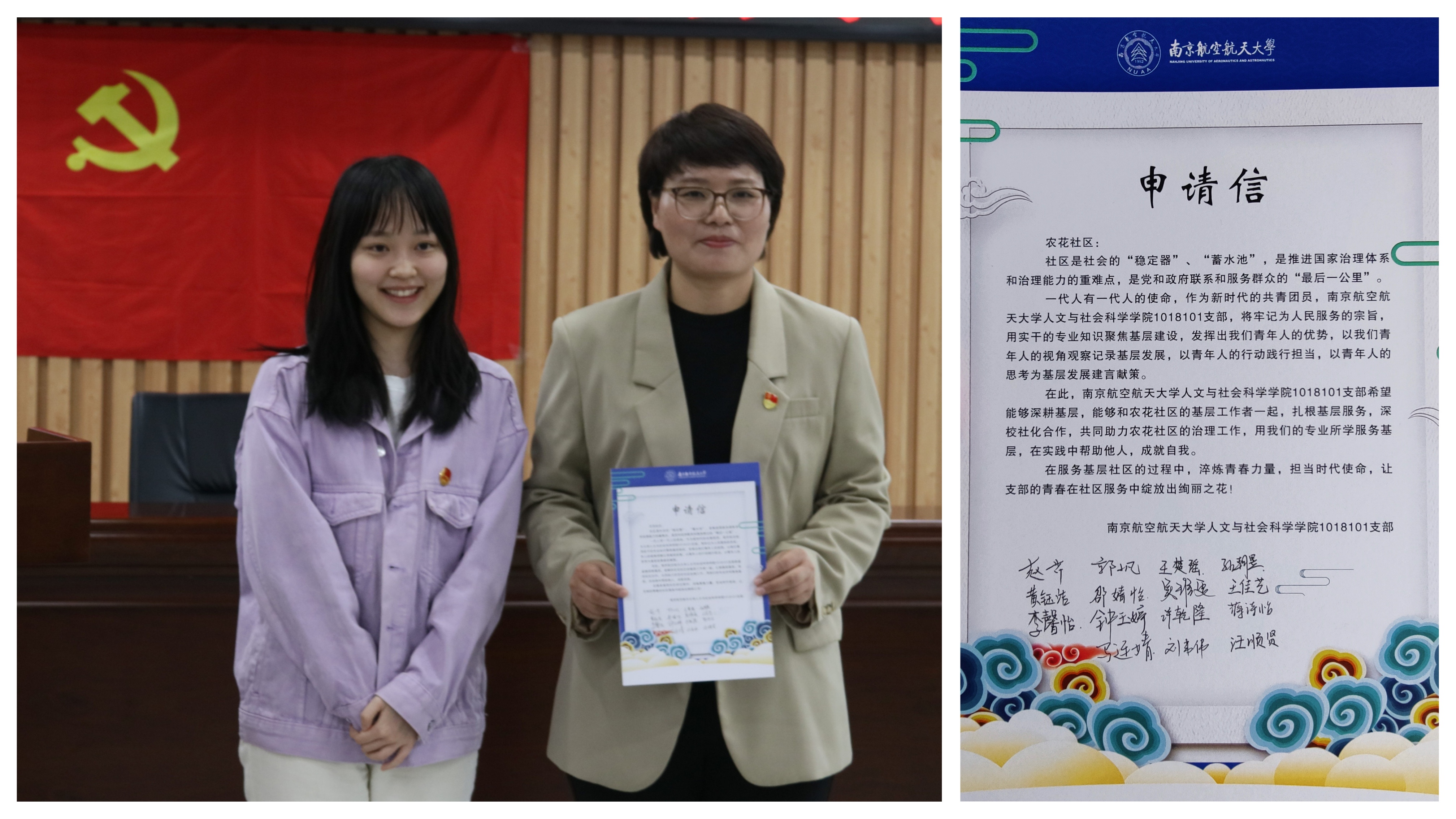 随后农花社区团总支副书记马青以一段感人的朗诵,讲述了她和与她一样千千万万的基层工作者们平凡中的伟大坚守。团支部青年赵芹则分享了自己在“淬炼红心”校社联动实践平台中的历练成长。听完他们的讲述,支部青年、社区网格员们纷纷表达了自己将青春力量融入新时代基层社区治理的美好愿望。1018101支部也郑重向农花社区递交“向基层报到”的申请书,要用实际行动让青春在党和人民最需要的地方绽放绚丽之花。社区主任谢玉秀接过聘书向支部团员青年们表达感谢也提出了利用好专业知识,探索解决社区问题新方案的殷切期望。