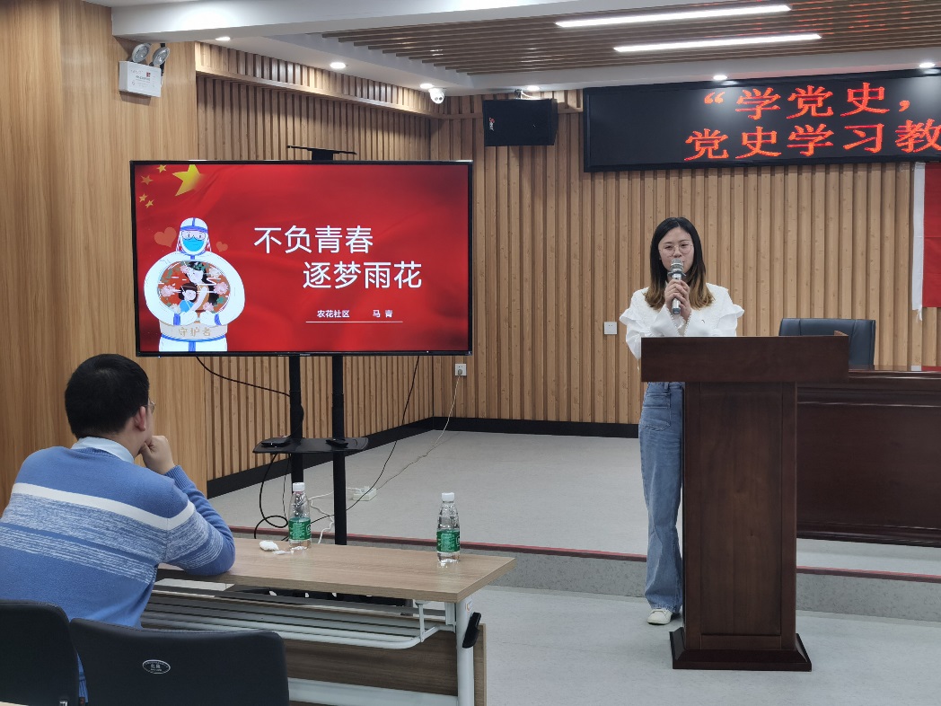 活动在青年学子读党史,基层青年讲团史中展开。支部青年郭小凡同学从中华苏维埃共和国临时中央政府建设中的党史小故事讲起,带领大家深刻学习领悟了党保持优良作风、坚定人民立场的先进品质。雨花街道团工委书陈晨则深情地回顾了承载了几代共青团员火热青春的“共青团路”的历史沿革。随后马克思主义学院教师李飞翔从当时民主法制建设的智慧到现今疫情冲击下的基层治理模式深刻启迪,引发青年们深思。青年代表的讲述也激励着在座的每一位青年关心国家大事、关注社情民意,立足于自身的知识和技能,通过志愿活动、实习实践等方式,为‘小我融入大我’的实践矢志奋斗。