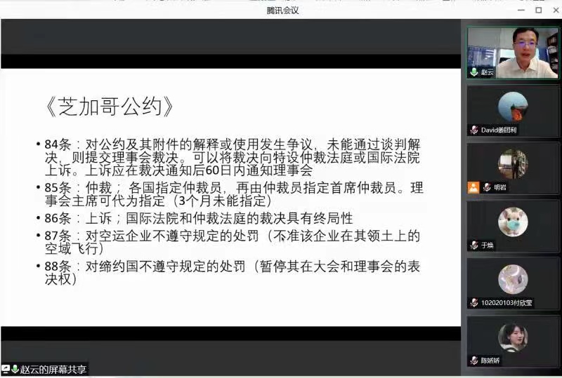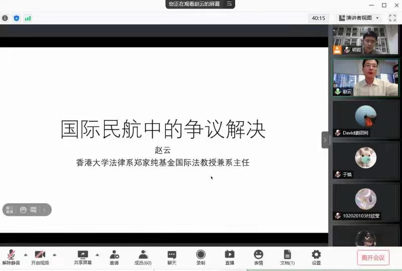 6月3日晚,人文大讲堂第29期在线顺利举行,香港大学法律学院法律系主任、博士生导师赵云教授在腾讯会议为大家带来了“国际航空的争议解决”系列讲座第一场。讲座由人文学院王炳教授主持,聂明岩副教授作为与谈人,各年级本科生、硕士生参加了讲座。