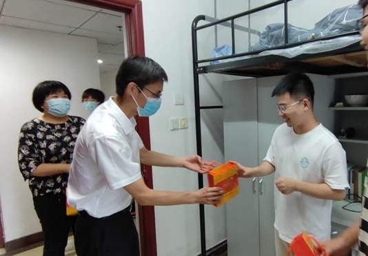 院领导先后走访了南区35栋、36栋研究生宿舍,向留校的学生们转达了学校和学院的关怀慰问。刘虎书记将学校、学院准备的月饼、水果送到学生手中,与同学们畅谈近期的学习生活,了解了同学们在校近况,勉励同学们在疫情期间,要充分利用在校时间,加强和导师之间的沟通交流,制定好未来目标计划,合理安排学习、科研活动。
