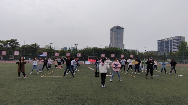 活动伊始,由四位老师带领同学们跳兔子舞作为赛前热身。同学们自觉排好队形,保持间距,积极在运动场上舒展身姿,气氛一下子活跃了起来。