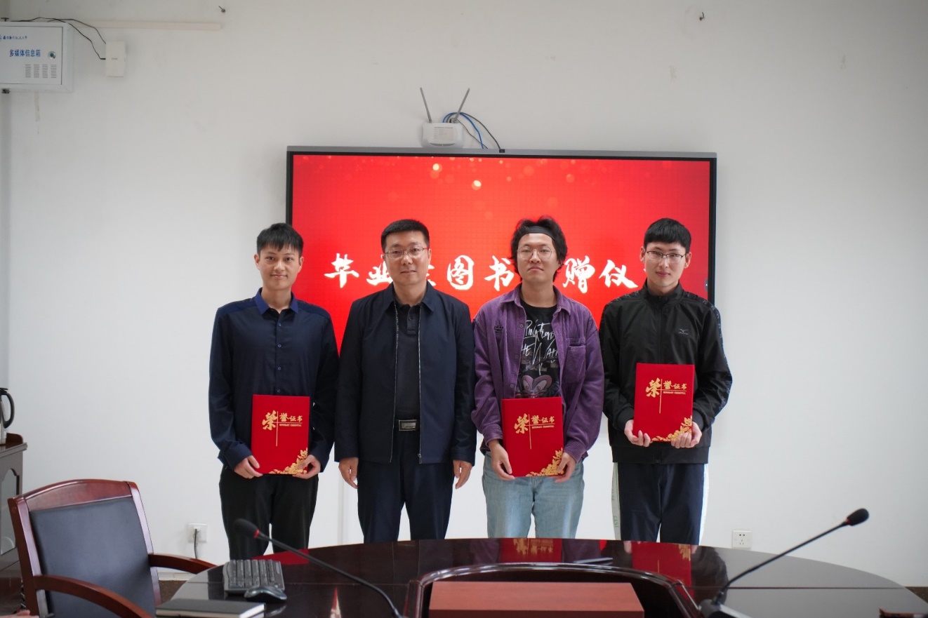 在毕业生图书捐赠仪式中,2022届毕业生康淇、符 文 强、胡海洋、王腾将自己的54本专业书籍捐赠给了学院,传递人文书香,情系学生成长。楚广兴代表学院接受了毕业生们的图书捐赠,并为他们颁发了捐赠证书作为纪念。