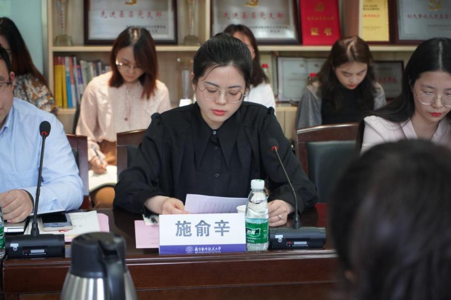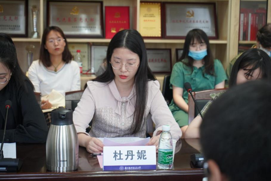 随后, 2020级硕士第一党支部书记杜丹妮与本科生党支部书记、辅导员施俞辛分别发言。杜丹妮表示,作为一名研究生党支部书记,要以支部工作为抓手,通过深入到同学们中去做工作,切实帮助同学们解决急难愁盼的问题。施俞辛结合实际工作,从帮助学生端正入党动机、提升自我理论素养、做好党员的自我教育与管理等三个方面分享了自己的心得体会。