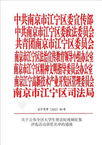 江宁区大学生普法短视频征集评选活动由江宁区区委政法委、区委宣传部、团区委、区法制办、区文明办等单位主办,江宁高新园、区司法局等单位承办。