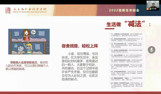 为进一步做好本科生入学教育工作, 9月1日晚,人文学院2022级本科生年级会在线顺利召开,全体2022级本科生参加了会议。