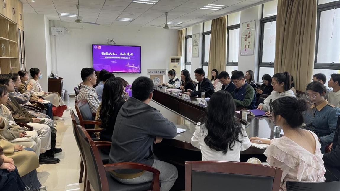 4月7日下午,韩漫画 举办“帆起人文,志在凌云”2023届硕士研究生座谈会。院党委书记楚广兴、副院长茅晓嵩、院长助理聂明岩及辅导员赵燕喃、施俞辛参加了座谈会。会议由赵燕喃主持。