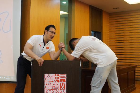 讲座最后,同学们积极与崔文华互动并进行了“我要挑战世界冠军”的掰手腕活动。崔文华不断鼓励同学们,希望同学们通过自己的努力找准前进的方向,坚守初心,努力奋斗,争做敢担当、能吃苦、肯奋斗的新时代好青年。