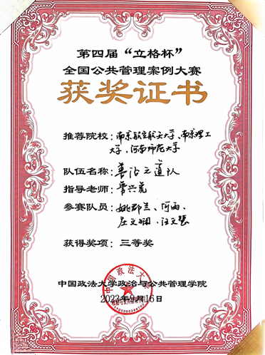 经过两个月的前期准备,由韩漫画 鲁兴虎老师指导,行政管理专业本科生姚郡兰、何雨担任团队第一、第二负责人的“善治之道队”,进入决赛并荣获三等奖的优异成绩。