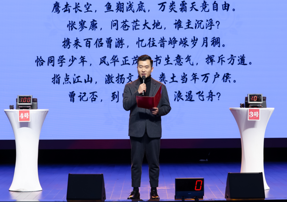 在周正坤的带领下,全场师生集体诵读《沁园春·长沙》,从历久弥新的红色经典中汲取信仰的力量,以美丽的诗词画卷为引,开启一场诗词之旅。