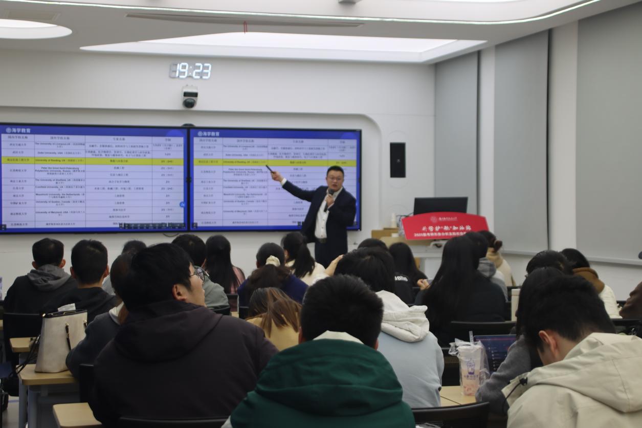 213智慧教室开展。南京市社会培训行业协会副会长、海学考研创办人刘秀全受邀开讲,他就考研面临的机遇和挑战、专业院校的选择和应对策略等方面为同学们提供辅导。本次活动由本科生辅导员聂小芳主持。