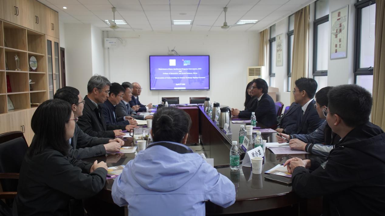 院党委书记楚广兴首先对郑镇根教授一行的来访表示热烈欢迎,并对学院情况进行了介绍。高志宏就两院加强交流合作表示高度支持,针对双方科学研究合作、师生互访等事宜提出相关建议。郑镇根希望能进一步加强同学院的合作,愿意为交换学生提供优惠待遇。最后,郑镇根和高志宏分别代表各自学院签署了院际交流合作协议。