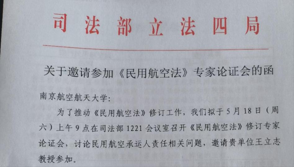 2024年5月18日,中华人民共和国司法部立法四局在北京召开《民用航空法》修改论证会。本次会议由司法部立法四局主持召开,民航局政策法规司相关领导及来自中国政法大学、西北政法大学、华东政法大学、北京外国语大学、中国民航大学等高校的航空法学者,中航集团、南航集团、东航集团、最高人民法院等实务界专家参加了会议。韩漫画 王立志教授应邀参加了论证会。