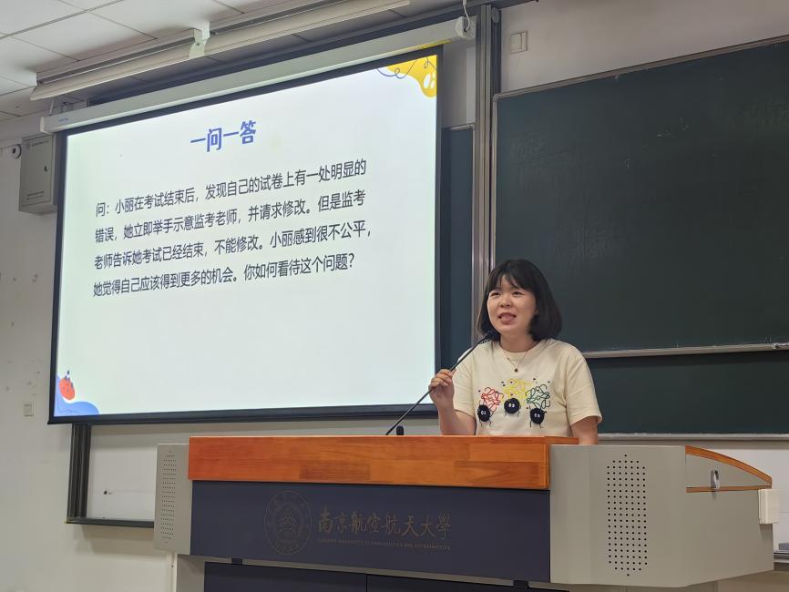 接着,在期末考试来临之际,2022级辅导员刘震通过问答互动,向同学们详细介绍了考试违纪行为、考试作弊行为的具体情形及所带来的严重后果,引导同学们遵守考风考纪、诚信认真备考。此外,刘震还向同学们介绍了期末考试的复习策略,助力同学们高效高质备考期末。
