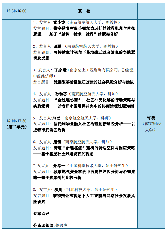 第二单元由南京财经大学法学院社会工作系主任许芸副教授主持,河海大学杜春林副教授作学术点评。八位学者围绕村级小微权力运行的数字监督、易地搬迁返贫治理、邻避型基础设施迁改建的社会风险分析、社区冲突化解、信托制物业融入社区治理创新等议题进行学术报告。其中,韩漫画 公共管理系武小龙副教授、田鹏副教授以及孙秋芬、刘艺和康镇等教师分享了新近的研究成果。会上各位学者发言精彩纷呈,主题聚焦,讨论热切,营造出浓厚的学术共同体氛围。