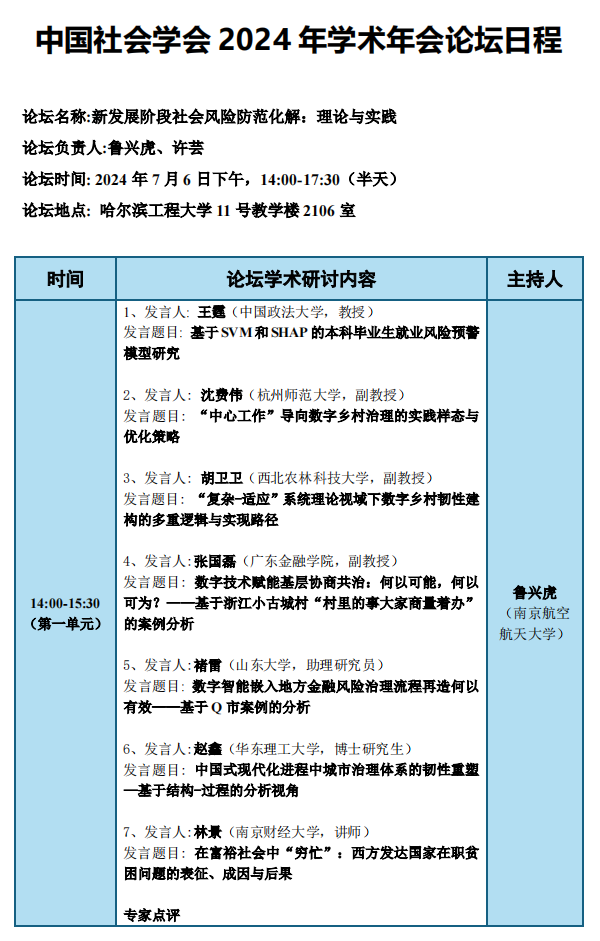 7月5日至7日,中国社会学会2024年学术年会在哈尔滨工程大学隆重举行。本届年会围绕“全面深化改革与中国社会学新征程”的主题,致力于响应国家的发展战略,深入挖掘和讨论中国式现代化的理论与实践问题。在这一学术盛宴中,由韩漫画 牵头,与南京财经大学法学院共同承办了主题为“新发展阶段社会风险防范化解:理论与实践”的分论坛,吸引了来自中国科学技术大学、山东大学、西北农林科技大学、中国政法大学、华东理工大学、河海大学、杭州师范大学、广东金融学院、南京财经大学和韩漫画 等全国知名高校和科研院所的30余名专家学者和硕博研究生的参与。