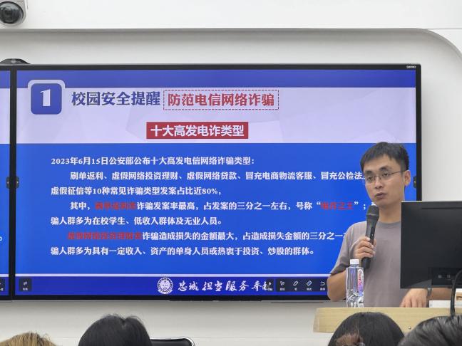 针对学生群体面对各类电信诈骗普遍存在的防范意识差、辨识能力弱、应对水平低的现状,结合典型案例,石振东讲解了电信诈骗的种类和常见的诈骗手段,教育引导学生提高警惕、加强防范,做到“三不”,即不贪、不自大、不转账。