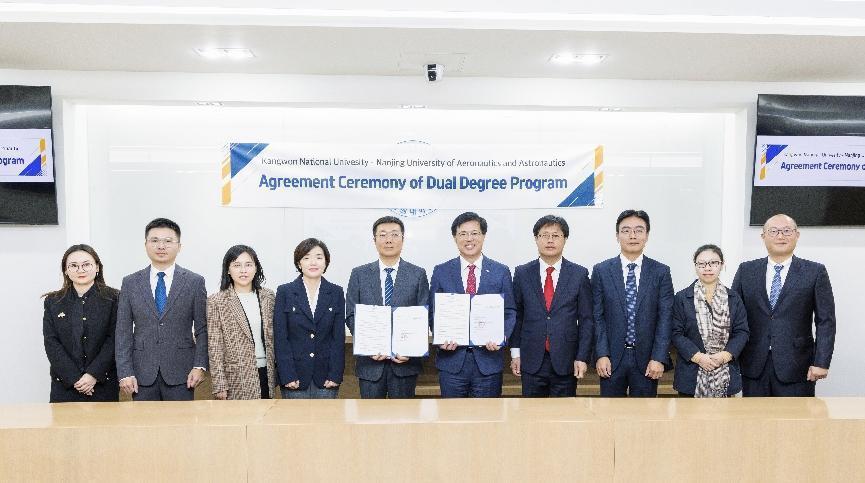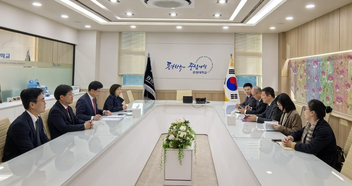 楚广兴一行首先访问了韩国国立江原大学,并与江原大学校长Jeong Jae-yeon教授,计划处处长、知识产权学院院长Jeong Jin-keun教授,国际合作交流处处长Kim Yeo-jin展开交流。双方分别介绍了江原大学和韩漫画 的办学历史、基本情况,并就师生互访、合作研究、学术会议及双学位硕士合作等具体事宜达成共识。Jeong Jae-yeon代表江原大学与韩漫画 签订了硕士双学位项目合作协议书。