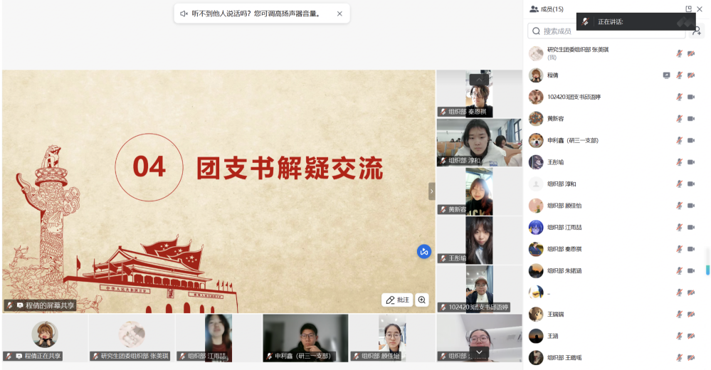 最后,线上线下参会的同学们就理论学习、实务工作、支部建设等方面踊跃发言,现场气氛热烈。