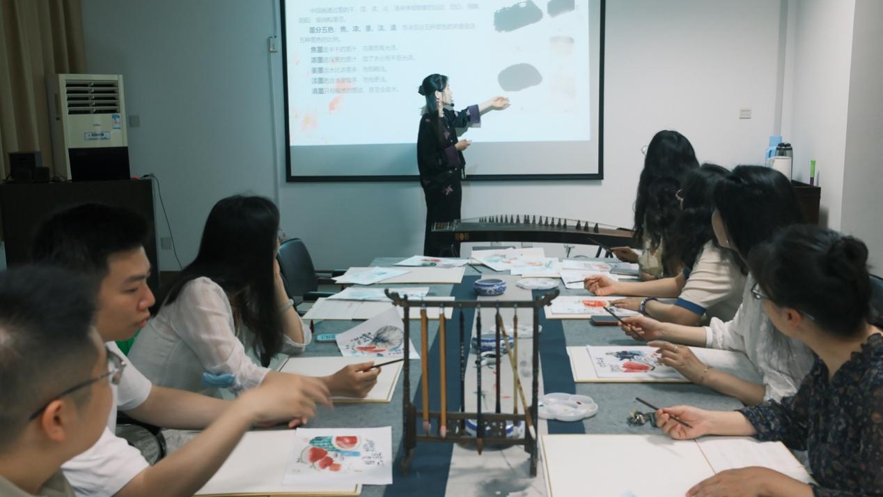 活动现场,龚静为大家详细讲解了国画的基本技巧。从笔法、墨法到构图法,让教职工们深入了解国画。授课现场一曲《渔舟唱晚》为现场增添了高雅的人文艺术氛围。绘画过程中,老师们大胆发挥,创作出了一幅幅精美的国画作品。