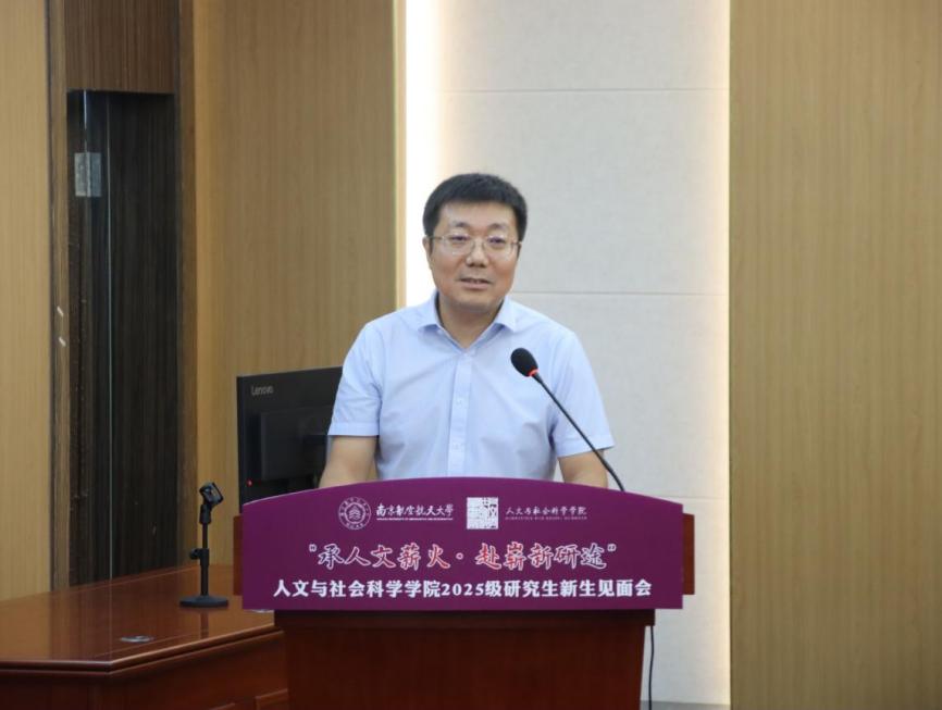 研工部副部长雷蕾向各位新同学的到来表示热烈欢迎。她强调,研究生阶段是知识深化、能力提升、思维碰撞的黄金时期,希望同学们能正确认识导学关系、同辈关系、小我与大我的关系,在青春奉献中彰显人生价值。她祝愿2025级新同学们在南航、在人文学院能不忘初心、坚守理想、收获成长。