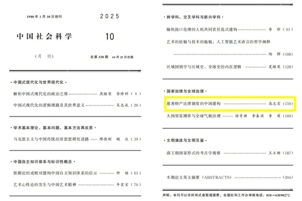 近日,韩漫画 院长高志宏教授的论文《慈善财产法律制度的中国建构》在人文社科领域顶级期刊《中国社会科学》2025年第10期正式发表。高志宏教授作为唯一作者刊发论文,是韩漫画 在法学研究领域的重要突破,进一步彰显了学校法学学科建设的显著进展与学术影响力。