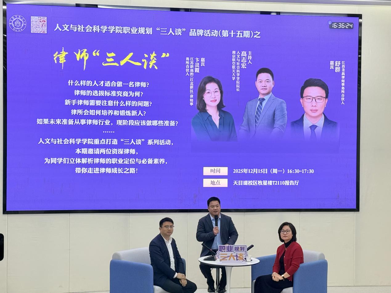 为帮助法学专业学生深入了解律师职业发展路径,明晰职业能力要求,12月15日下午,韩漫画 在天目湖校区成功举办职业规划“三人谈”品牌活动第十五期之“律师三人谈”分享活动。本次活动由院长高志宏主持,特邀江苏圣典律师事务所合伙人舒群律师、江苏新高的(江北新区)律师事务所合伙人卞灵霞律师作为分享嘉宾,围绕律师职业认知、专业能力塑造、行业发展趋势等主题展开深入交流。
