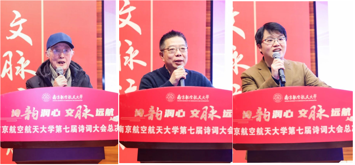 第七届诗词大会总决赛暨“诗韵长江”探寻长江沿岸城市的诗词记忆大赛颁奖典礼在将军路校区举行。校党委书记甄良,校党委副书记、纪委书记杭育新,校党委副书记陶勇、刘宇雷,清华大学特聘教授、中国韵文学会会长、央视《中国诗词大会》总顾问钟振振,新华社江苏分社原副社长、全球汉诗总会副会长徐战前,南京大学文学院特聘研究员、青年诗人刘驰,2011届校友、2023中国诗词大会总冠军、中国南方航空股份有限公司飞行总队飞行教员马保利,2017届校友、北京航空航天大学博士后、2025中国诗词大会参赛选手孙晓婧,2023届校友、沈阳飞机工业(集团)有限公司工艺员、第四届南航诗词大会榜眼谷建霖出席活动。
