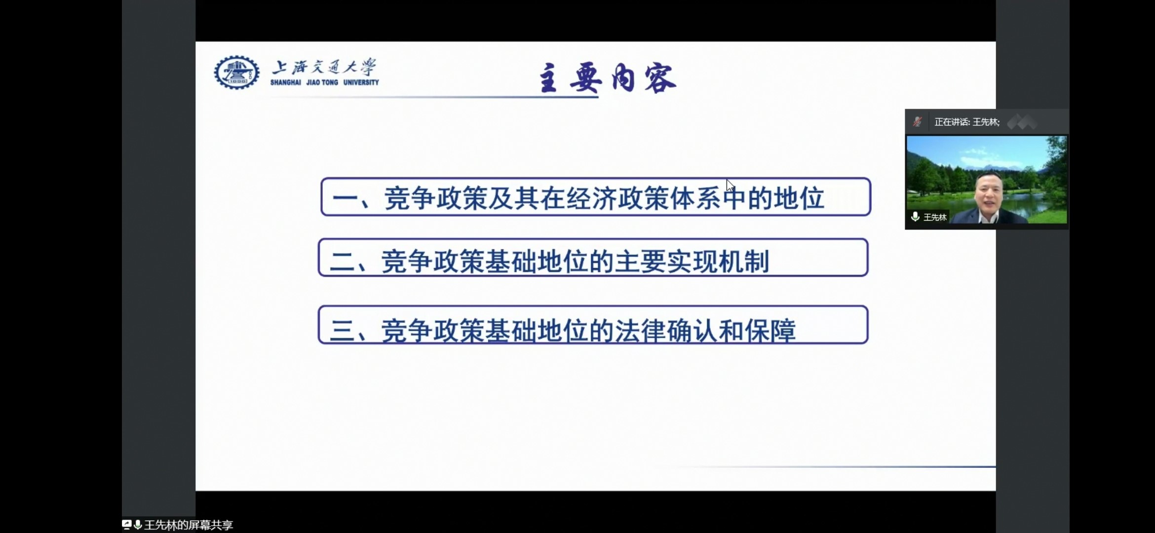 王先林教授以“竞争政策的基础地位及其实现机制”为主题与同学们做了精彩分享。王教授从竞争政策在经济政策体系中的地位、竞争政策基础地位的主要实现机制和竞争政策基础地位的法律和确认保障三个层面讲述了市场经济背景下竞争政策的重要法律问题。