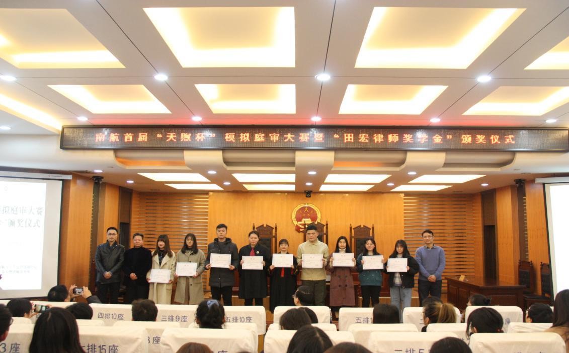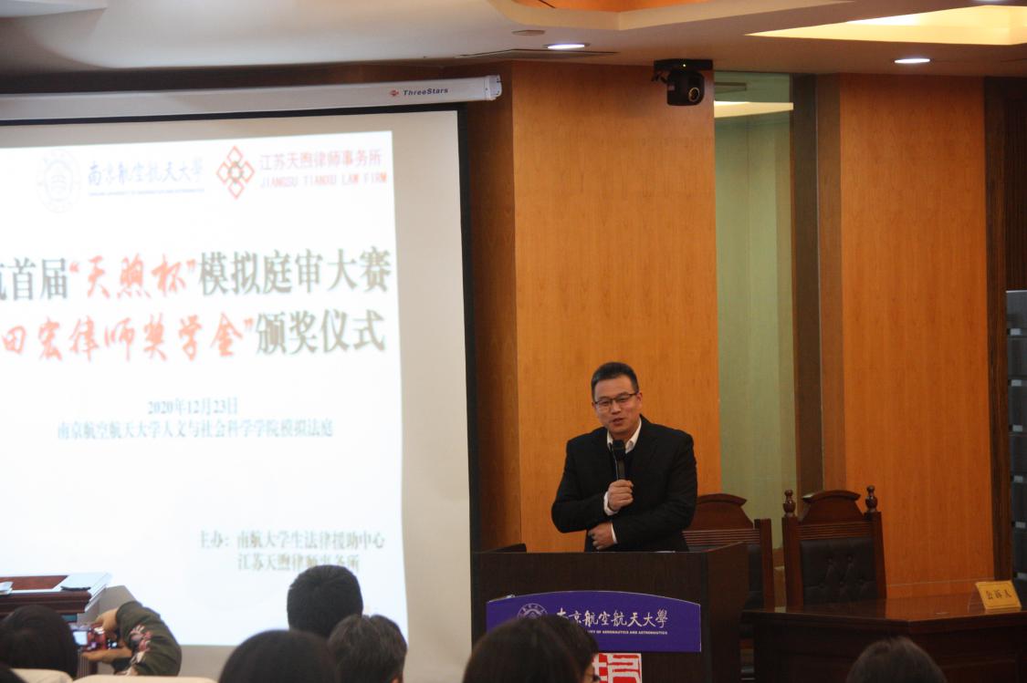 12 月 23 日下午,南航首届“天煦杯”模拟庭审大赛暨“田宏律师奖学金”颁奖仪式于模拟法庭隆重举行。本次活动由韩漫画 主办,校大学生法律援助中心承办,江苏天煦律师事务所参与协办。江苏天煦律师事务所主任田宏等,校党委宣传部、学生处、研究生院、校团委及韩漫画 部分领导、老师出席比赛。18 级法学本科生、20 级法律硕士研究生代表参加模拟庭审比赛决赛,全校部分师生到场观看比赛。
