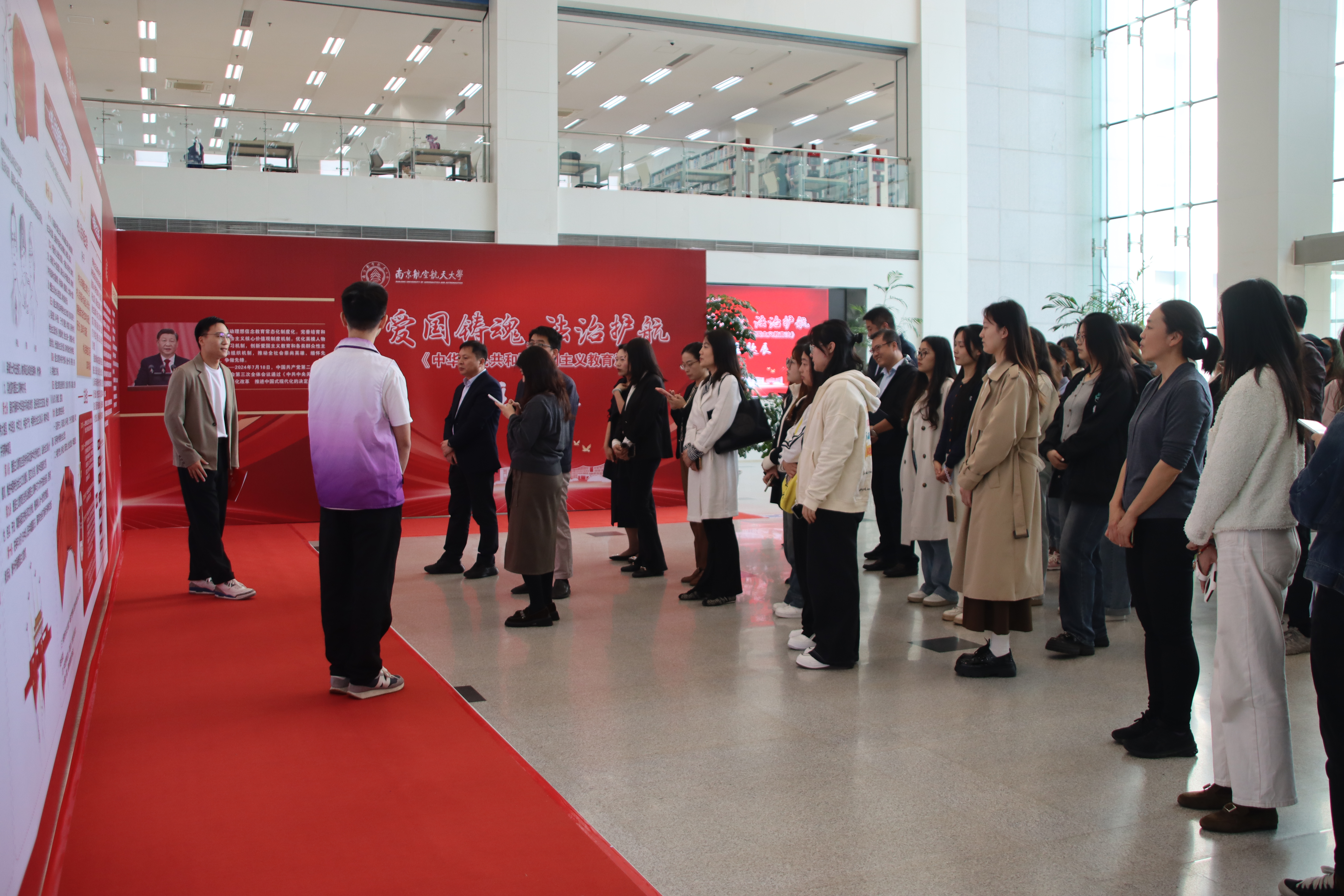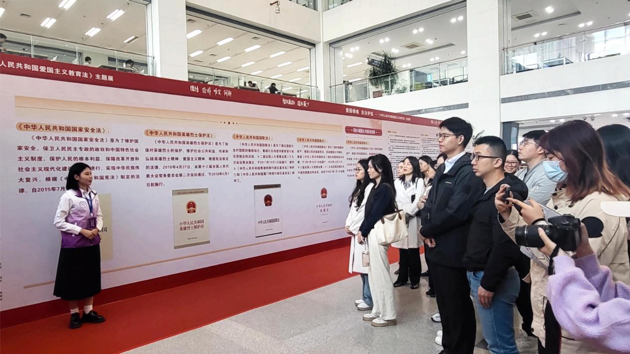 王晖介绍了本次主题展基本情况,她表示本次主题展突出三个重点。一是突出重大举措。这是我国第一部关于爱国主义教育的法律,意义重大,影响深远;二是突出内涵解读。延伸普及了《国旗法》《国家安全法》等相关法律,让师生能够全面、系统、丰富了解《爱国主义教育法》的内涵和外延;三是突出具体实践。内容结合了典型案例,师生在受到警醒的同时,也与日常生活、科研学习相融合,成为规范自身言行的准则。