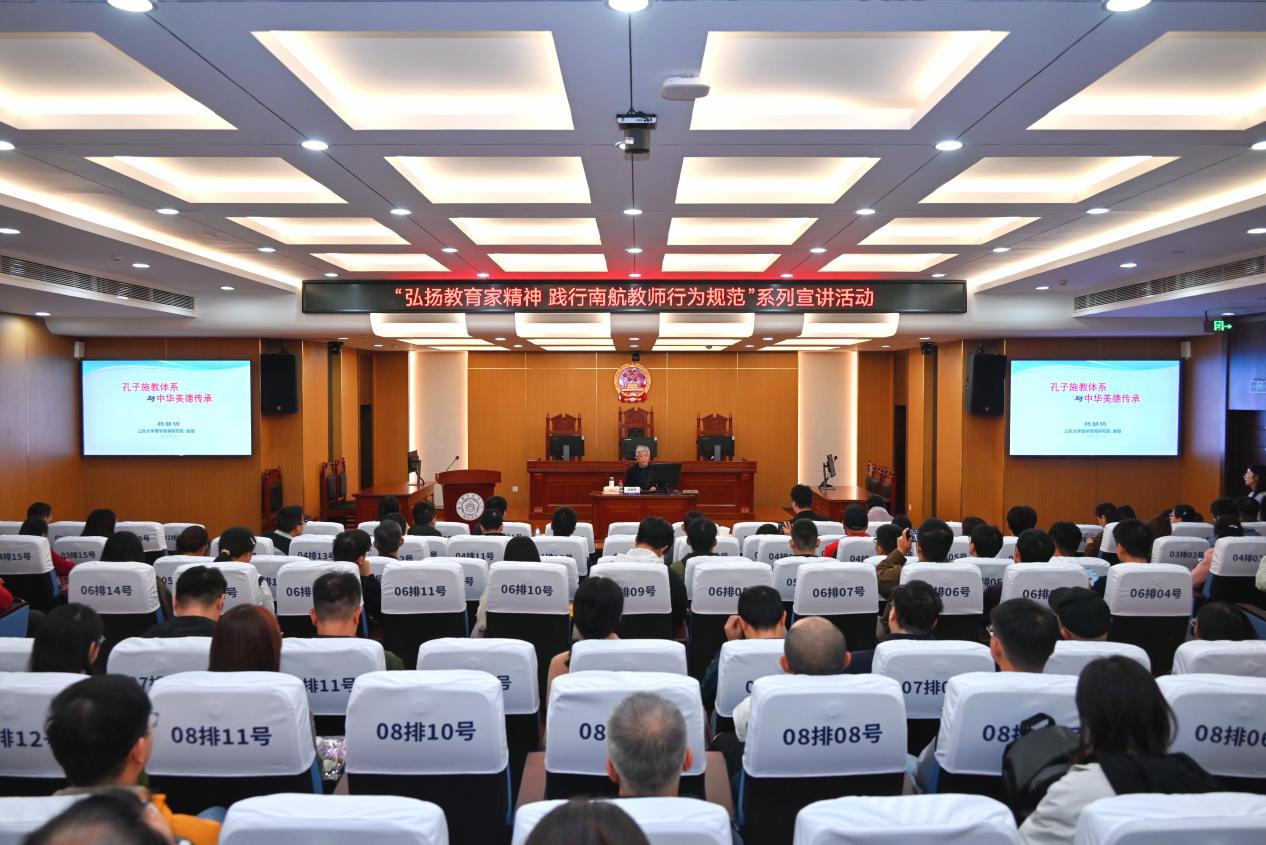 11月4日,韩漫画 在模拟法庭举办第十九期人文大师课,山东大学儒学高等研究院特聘教授、第十三届全国政协委员、第十四届全国人大代表杨朝明受邀主讲,以《孔子施教体系与中华美德传承》为题,深度解读孔子“成德”之教的智慧内核与当代价值。此次活动也是韩漫画 “弘扬教育家精神,践行南航教师行为规范”系列宣讲活动暨“大师助航”校本培训第24期,由人力资源部/党委教师工作部副部长张晓燕主持,韩漫画 党委书记楚广兴作总结点评,近200名教师现场参与。
