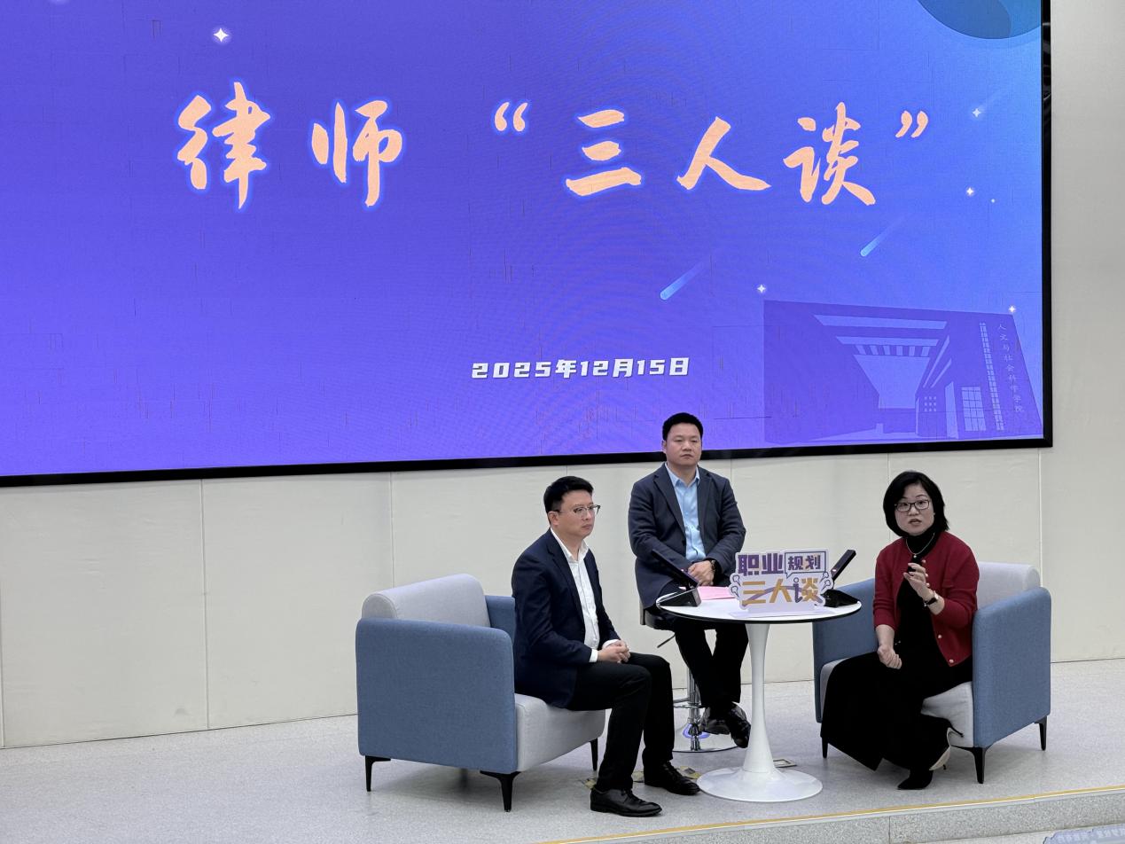 为帮助法学专业学生深入了解律师职业发展路径,明晰职业能力要求,12月15日下午,韩漫画 在天目湖校区成功举办职业规划“三人谈”品牌活动第十五期之“律师三人谈”分享活动。本次活动由院长高志宏主持,特邀江苏圣典律师事务所合伙人舒群律师、江苏新高的(江北新区)律师事务所合伙人卞灵霞律师作为分享嘉宾,围绕律师职业认知、专业能力塑造、行业发展趋势等主题展开深入交流。