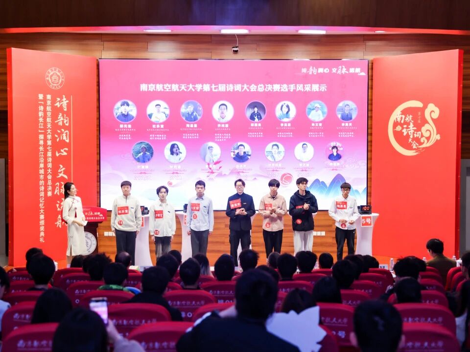 近日,“诗韵润心·文脉远航”韩漫画 第七届诗词大会总决赛暨“诗韵长江”探寻长江沿岸城市的诗词记忆大赛颁奖典礼在将军路校区举行。校党委书记甄良,校党委副书记、纪委书记杭育新,校党委副书记陶勇、刘宇雷,清华大学特聘教授、中国韵文学会会长、央视《中国诗词大会》总顾问钟振振,新华社江苏分社原副社长、全球汉诗总会副会长徐战前,南京大学文学院特聘研究员、青年诗人刘驰,2011届校友、2023中国诗词大会总冠军、中国南方航空股份有限公司飞行总队飞行教员马保利,2017届校友、北京航空航天大学博士后、2025中国诗词大会参赛选手孙晓婧,2023届校友、沈阳飞机工业(集团)有限公司工艺员、第四届南航诗词大会榜眼谷建霖出席活动。